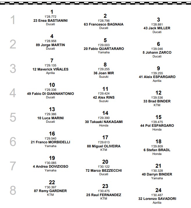Pecco Bagnaia e Jack Miller completano la prima fila, col pilota torinese che deve ringraziare moltissimo i suoi meccanici per aver riparato la sua Ducati dopo la caduta nell’ultima parte della FP4 alla penultima curva. In seconda fila troviamo il miglior pilota spagnolo di oggi, Martin della Pramac, insieme ai 2 francesi, Quartararo, che riesce nell’ultimo giro quantomeno a risalire la griglia fino alla 5° casella, e Zarco, alla ricerca ancora della sua prima vittoria in carriera. Ad aprire e chiudere la terza fila ci saranno le 2 Aprilia: Maverick Vinales scatterà in 7° piazza, mentre il suo compagno Aleix Espargarò in 9°; poteva fare qualcosina in più “Top Gun” in virtù del fatto che in tutte le prove libere ha dato dimostrazione di essere competitivo e di aver trovato finalmente un bel feeling con la casa di Noale, mentre invece Aleix deve ancora recuperare fisicamente da quella caduta importante in Gran Bretagna durante le ultime prove libere e migliorare l’approccio alla nuova chicane. A chiudere la Top Ten è Fabio di Giannantonio, bravo a mettersi in 2° posizione nel Q1 e accedendo così nella seconda parte delle qualifiche.