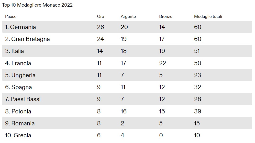 118 medaglie nell’arco di 10 giorni fra Roma e Monaco di Baviera. Se l’anno scorso eravamo stati uno dei migliori paesi dell’Europa nelle Olimpiadi di Tokyo per numero di medaglie ottenute, beh in questa settimana e mezza, con lo svolgimento dei campionati europei di tante specialità sportive, quel numero in tripla cifra parla da sé: a Roma, dove è andato in scena l’Europeo del nuoto, l’Italia ha portato a casa 67 medaglie, mentre a Monaco di Baviera, dove si è disputata la seconda edizione dei campionati europei multisport (una specie di mini Olimpiade del Vecchio Continente), la nazionale è tornata in patria con 51 medaglie.